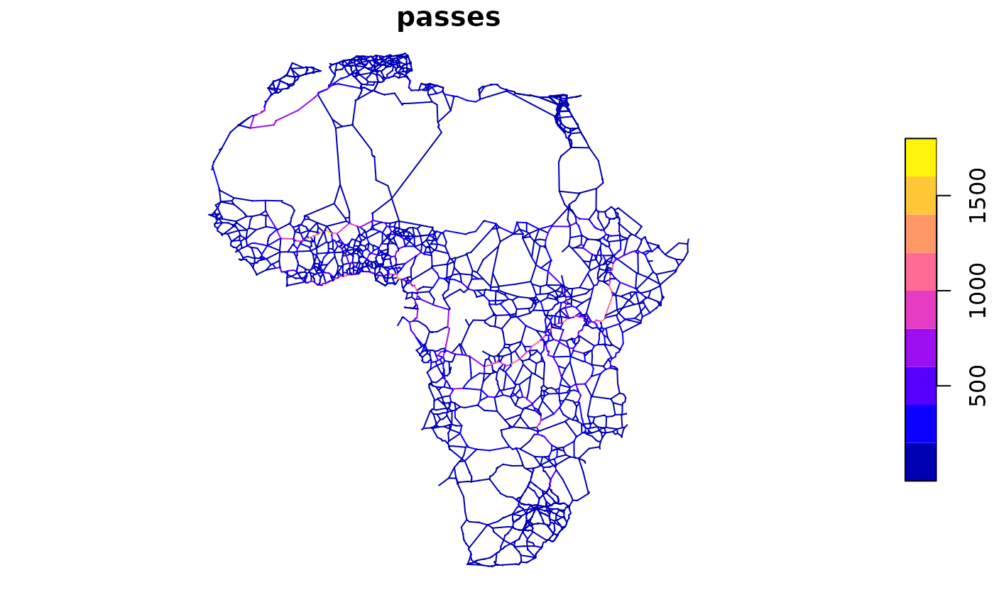 The passes field indicates how many optimal city-to-city routes use each segment,
